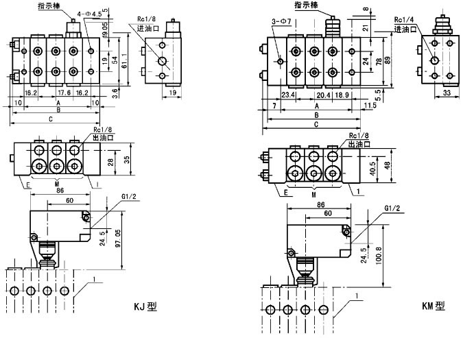 KJ、KM、KL系列單線遞進式分配器,它由中碳合金結(jié)構(gòu)鋼制造的供給體、端部體和3~8片根據(jù)設(shè)計需要所確定的給油量和出油口數(shù)的中間體組合而成。分配器的正常出口設(shè)置于分配器的兩側(cè)面,在上面還設(shè)置有預(yù)備出口,各中間體的出油口內(nèi)均裝有止回閥,能徹底防止因潤滑點背壓作用而產(chǎn)生潤滑脂的逆流,保證了各出油口的給油量定量、準(zhǔn)確。